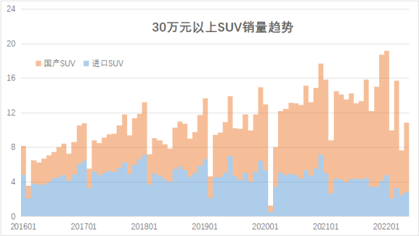 根据上险数据显示,2016-2022年国内30万以上SUV呈现逐年递增趋势,伴随着新能源车的走俏,国产的高端自主品牌也觅得一席之地。
