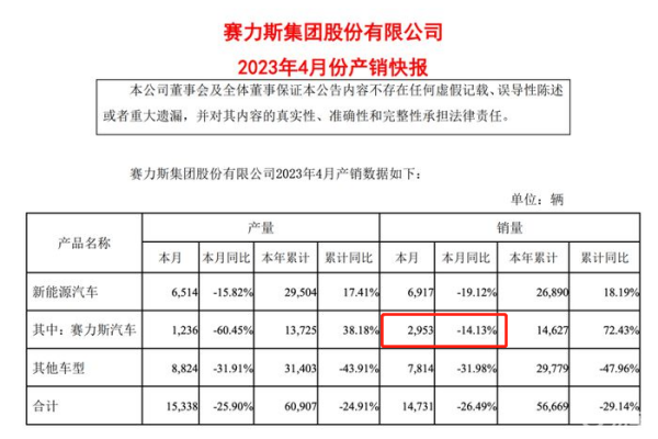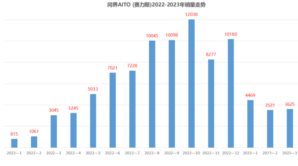 但到了2023年却没有延续热度,销量出现断档,如果说1月份和2月份是受到春节假日休市期还能理解,但在3月份的市场复苏期也只有3625辆,上升幅度非常微弱。到了4月份,根据赛力斯的产销快报,销量仅为2953辆,但有趣的是,其对外公布的数字却是4585辆,出现了罗生门。