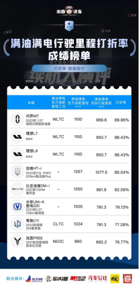 满油满电续航打折率成绩榜单上,AITO问界M7以官方综合续航1100km实际989.6km、打折率89.96%的成绩荣获第一,满油满电实际行驶里程榜单排名第二。纯电能耗方面,AITO问界M7以152.3km的纯电实际行驶里程、19.7的百公里电耗成绩排名第二。纯电能打,燃油续航也是相当不错,AITO问界M7以官方燃油WLTC 905km、实际燃油续航837.3km、打折率92.52%的成绩排名第二。AITO问界M7以格外亮眼的综合表现,完美实现超长续航与节能的双向奔赴。