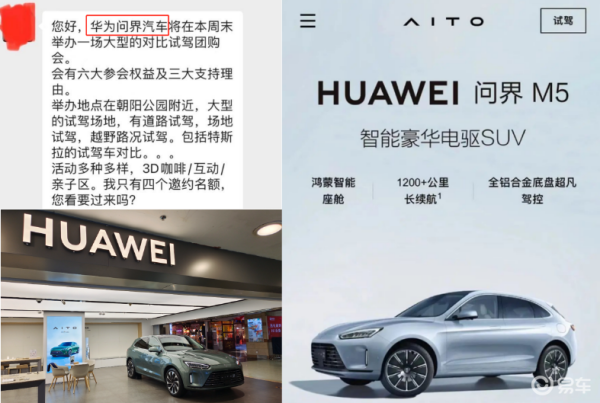 在早期的宣传中,AITO问界汽车是围绕“华为”展开,无论是线上海报还是线下的活动邀约,都会带上“华为问界汽车”。