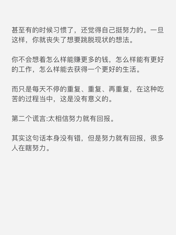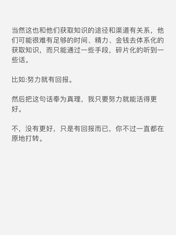 当然这也和他们获取知识的途径和渠道有关系,他们可能很难有足够的时间、精力、金钱去体系化的获取知识,而只能通过一些手段,碎片化的听到一些话。比如:努力就有回报。然后把这句话奉为真理,我只要努力就能活得更好。