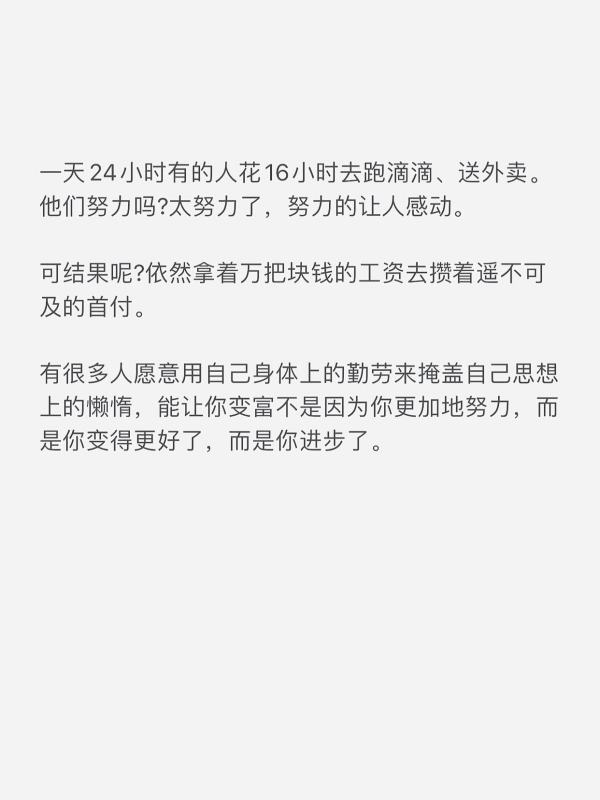 可结果呢?依然拿着万把块钱的工资去攒着遥不可及的首付。有很多人愿意用自己身体上的勤劳来掩盖自己思想上的懒惰,能让你变富不是因为你更加地努力,而是你变得更好了,而是你进步了。