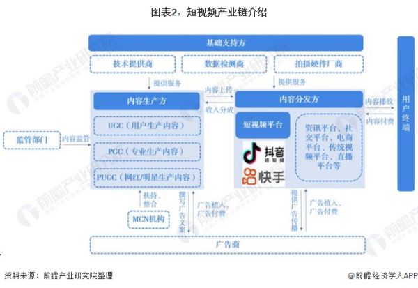 我国短视频行业产业链逐渐形成,产业链参与主体众多,包括内容生产方、内容分发方、用户终端、基础支持方(如技术服务提供商、数据监测商等)、广告商和监管部门等。内容生产方主要分为PGC(专业生产内容)、PUGC(网红/明星生产内容)和UGC(用户生产内容)三大类;内容分发方包括短视频平台、新闻资讯平台、社交平台、传统视频平台等。