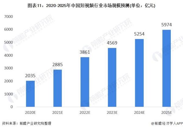 前瞻预测,由于疫情的爆发使得短视频的发展潜力进一步挖掘,2020-2022年短视频行业市场规模将以较快的增长速度增长,年复合增长率在44%左右;2023-2025年市场规模增速会有所放缓,但仍较保持16%的年复合增长率增长,2025年短视频行业市场规模将有望接近6000亿元。