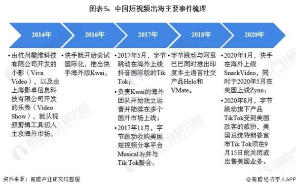 2016年底,快手开始尝试国际化,推出快手海外版Kwai;2017年5月,字节跳动也开始出海,在海外上线抖音国际版的Tik Tok,并把重心放在东南亚和日韩市场。负责Kwai的海外团队开始独立运营并陆续在多个国外市场上线。2017年11月,2017年11月,字节跳动收购美国短视频分享平台Musical.ly并与Tik Tok整合。2018年,字节跳动与阿里巴巴同时推出印度本土语言社交产品Helo和VMate。2020年4月,快手在海外上线SnackVideo,同时于2020年5月在美国上线Zynn。但是,在2020年8月,字节跳动旗下产品TikTok在美国迅速扩张的背景下受到美国政客的威胁,美国总统特朗普宣布Tik Tok须在9月15日前关闭或出售美国业务。