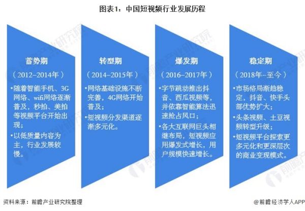 近年来,我国短视频行业发展迅速。截止目前,我国短视频行业已经经历了四个阶段,分别是蓄势期、转型期、爆发期和平稳期。目前处在平稳期,竞争格局逐渐稳定,短视频平台探索更多元化和更深层次的商业变现模式。