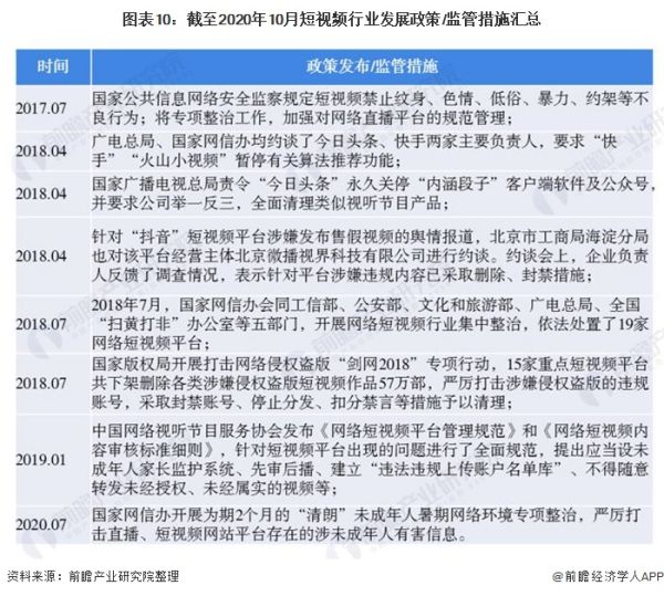 2017年7月,国家公共信息网络安全监察规定,短视频禁止纹身、色情、低俗、暴力、约架等不良行为。2019年1月,中国网络视听节目服务协会发布《网络短视频平台管理规范》和《网络短视频内容审核标准细则》,针对短视频平台出现的问题进行了全面规范。2020年7月,国家网信办开展为期2个月的“清朗”未成年人暑期网络环境专项整治,严厉打击直播、短视频网站平台存在的涉未成年人有害信息。