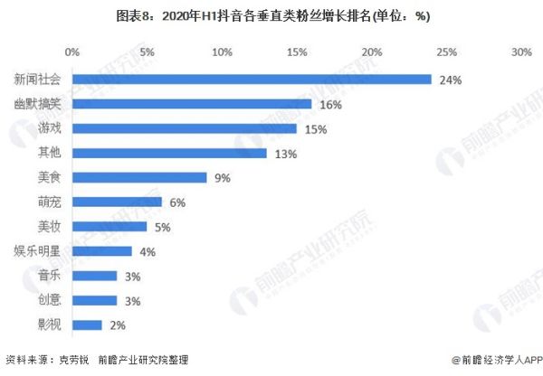 在增粉上,游戏、搞笑、美食等领域依旧处于领先地位。据克劳锐发布的最新《2020上半年短视频内容发展盘点报告》显示,抖音和快手两大头部短视频平台上的游戏、搞笑、美食领域KOL增粉排名均在前五。此外,新闻社会领域在疫情期间迅速发展,其中抖音平台的新闻社会类KOL增粉排名第一,增速高达24%。