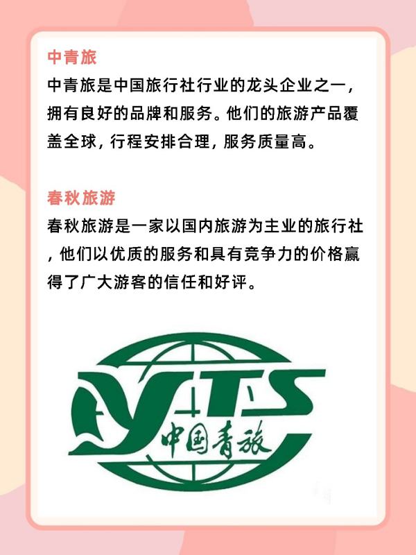中青旅:中青旅是中国旅行社行业的龙头企业之一,拥有良好的品牌和服务。他们的旅游产品覆盖全球,行程安排合理,服务质量高。