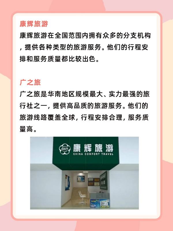 广之旅:广之旅是华南地区规模最大、实力最强的旅行社之一,提供高品质的旅游服务。他们的旅游线路覆盖全球,行程安排合理,服务质量高。