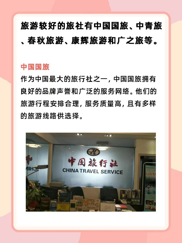 中国国旅:作为中国最大的旅行社之一,中国国旅拥有良好的品牌声誉和广泛的服务网络。他们的旅游行程安排合理,服务质量高,且有多样的旅游线路供选择。