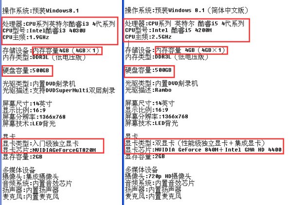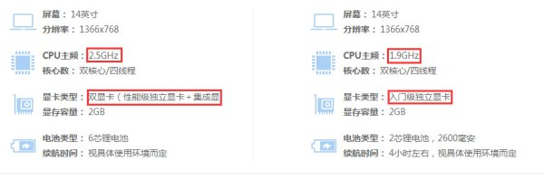 从这张简单的两台笔记本电脑配置图中可以看出(红框标出的地方),CPU的主频不一样,主频数越高说明CPU的性能越好,处理能力就越强;显卡类型也可能看着出,双显卡(性能级独立显卡+集成型)明显要强于入门级独立显卡。