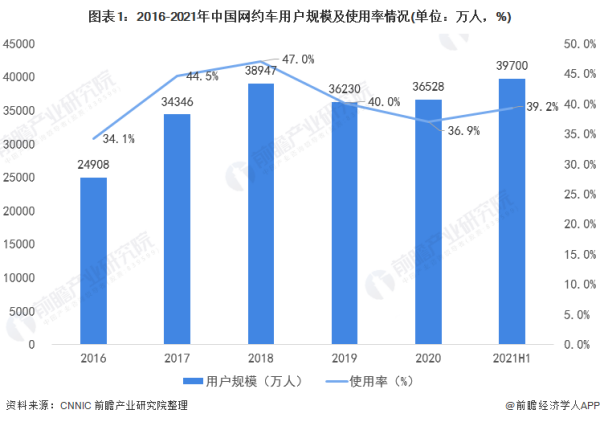 从用户规模来看,我国网约车用户规模及使用率大体呈稳定增长态势。2020年受全球新冠疫情影响,网约车用户使用率有所下滑,降至36.9%。但随着疫情影响的逐步减弱,截至2021年6月底,网约车用户规模回升至39700万人,使用率回升至39.2%。