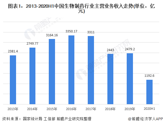 2019年我国规模以上生物制药企业实现主营业务收入2479.2亿元。2020上半年,生物制药行业主营业务收入达到1192.6亿元。