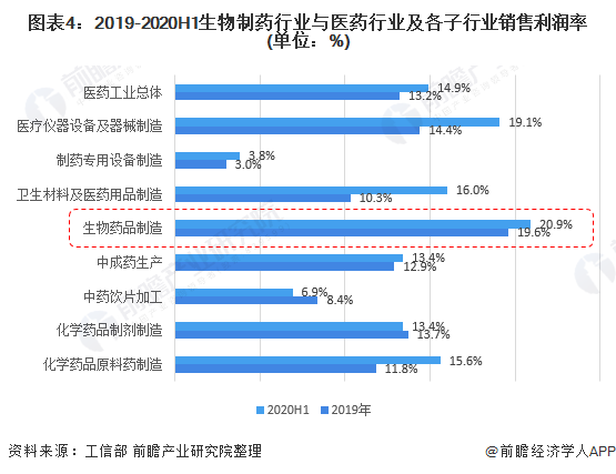 从利润率来看,2020年上半年医药工业整体销售利润率为14.9%,较上年同期(13.7%)提高1.2个百分点。2019年,生物制药行业利润率达到19.6%,2020上半年达到20.9%,均高于同期医药行业整体及各子行业利润率,总体来看,行业获利情况较好。