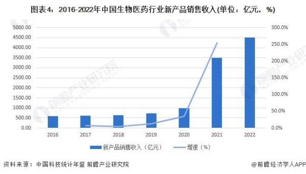 随着新产品研发经费支出的整体呈增长态势,2016-2021年期间我国生物医药行业新产品销售规模呈较快增长趋势。2021年我国生物医药行业新产品销售收入同比增长250%以上。2022年,中国生物医药行业新产品产销规模约为4507亿元。