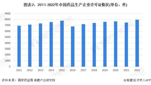 根据国家药监局的数据,2011-2022年,中国药品生产企业许可证数量在7500件左右平稳波动,总体来说,药品生产企业数量较为稳定。截至2022年底,各省(区、市)药品生产许可证数量为7974件,较2021年增加497件。