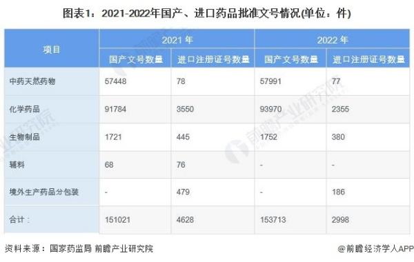 截至2022年,中国共有境内外药品批准文号156711件,其中国产文号数量为152713件,较2021年增加2692件;进口注册证号数量2998件,较去年减少1630件。