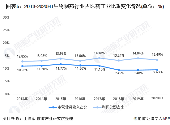 由以上分析可知,生物制药行业在医药工业中的地位较为重要,2013-2020上半年行业利润总额占比保持在12%以上,主营业务收入占比在9%以上。2019年生物制药行业主营业务收入比重和利润比重分别达到9.48%和14.04%;2020上半年分别为9.63%和13.49%。