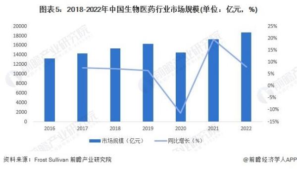 2016-2022年,我国生物医药行业的市场规模呈波动增长趋势,2020年由于疫情影响,生物医药行业规模有所下降。2022年,我国生物医药行业的市场规模达到1.87万亿元。