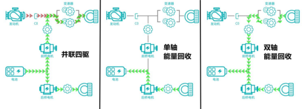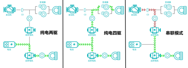 这套双电机串并联架构能够在低速时避开发动机的低效区,发动机仅作为充电工作,而在中高速阶段则能够通过两挡变速箱进行发动机直驱,使发动机工作在高效区间,达到节油目的。