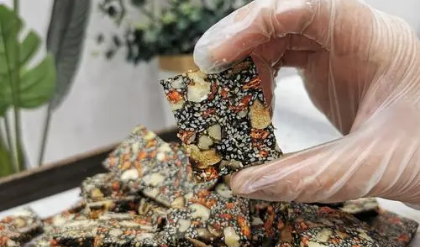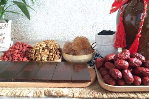 然后她我讲阿胶糕是药食同源的保健食品,不是药品,主要是阿胶,不过还会加上红枣、黑芝麻、枸杞、核桃仁等一些其他的营养好吃食品,所以它的味道是非常香的。