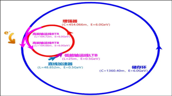 位于源头的电子枪产生高品质的电子束,经长约49米的直线加速器将电子束加速到0.5GeV,注入至周长450多米的环形增强器,继续提高能量到额定的6GeV。此时的电子束非常接近光速,然后被注入至更大的圆环——周长约1360米的储存环。