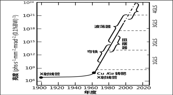 常规实验室用X光机是180度发光,它的亮度数量级大概是107~109,而同步辐射光源发光角度只有几个角秒(1度=3600角秒),X射线集中在这样小的角度发出来,它的亮度数量级就可以提升到1022,甚至以上。第三代同步辐射光源的X射线亮度是X光机的百亿到十万亿倍,第四代同步辐射光源又比第三代提高100~1000倍。
