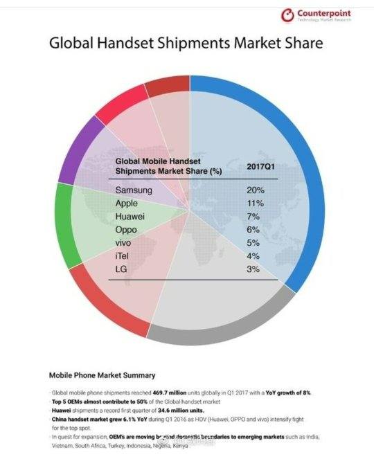 全球 三星第一,占20%;苹果第二,占11%;华为第三,占7%;OPPO第四,占6%;vivo第五,占5%;LG第七,占3%。