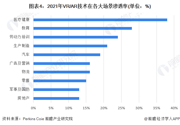 Coie数据,2021年,VR/AR在医疗健康领域的应用渗透率最高,超过35%,其次是在教育、劳动力培训、生产制造场景中的渗透率均已超20%。