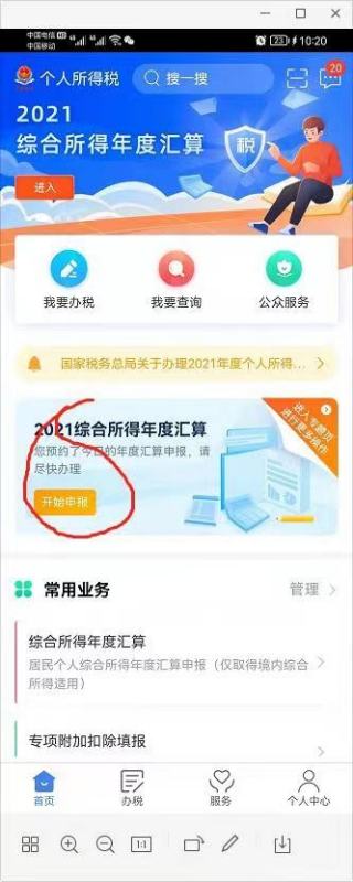 第二步,进入“个人所得税”APP首页,然后点击下方的开始申报。