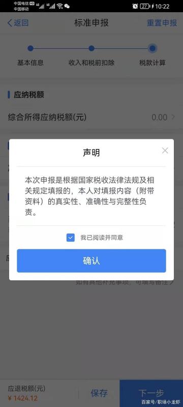 第四步,进行税款计算,同意声明,点击进行下一步;
