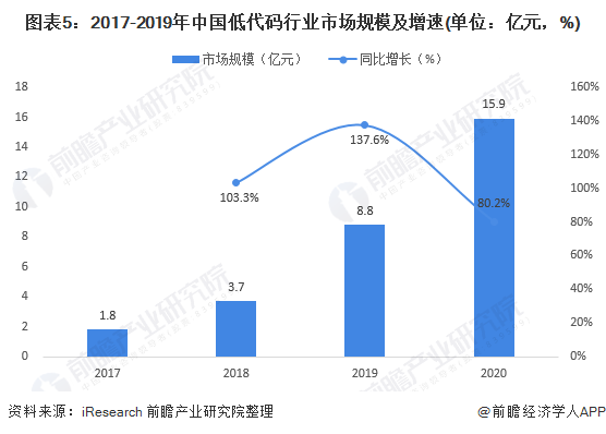2020年行业仍维持较高热度,基于前两年的快速增长及疫情影响,2020年低代码行业市场规模为15.9亿元,增速有所放缓至80.2%。