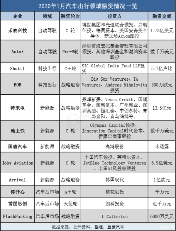那么,在1月份,汽车出行领域究竟有哪些企业获得了融资?盖世汽车日前进行了相关汇总,具体情况如下: