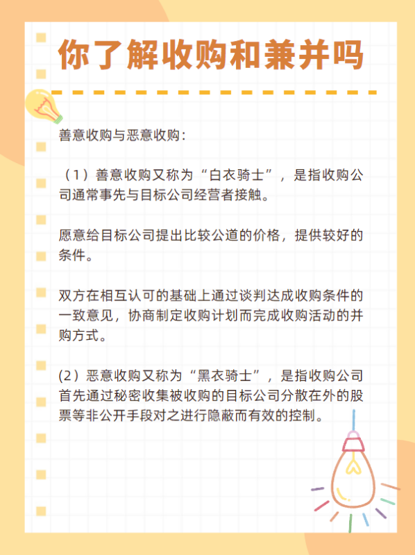 (1)善意收购又称为“白衣骑士”,是指收购公司通常事先与目标公司经营者接触。