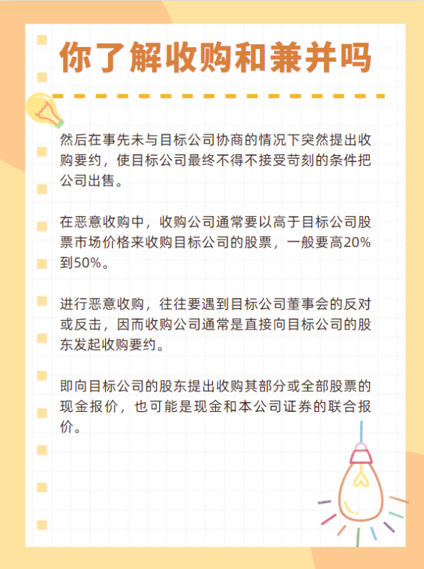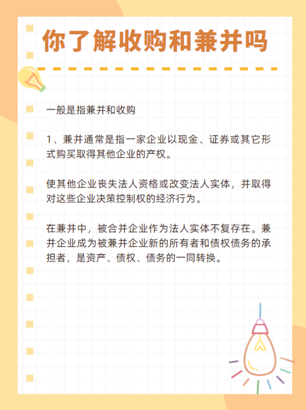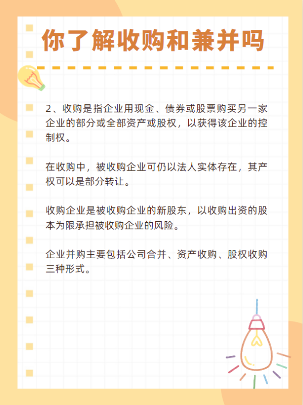 2、收购是指企业用现金、债券或股票购买另一家企业的部分或全部资产或股权,以获得该企业的控制权。