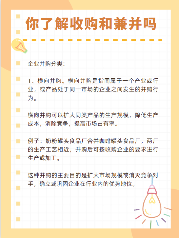 1、横向并购。横向并购是指同属于一个产业或行业,或产品处于同一市场的企业之间发生的并购行为。