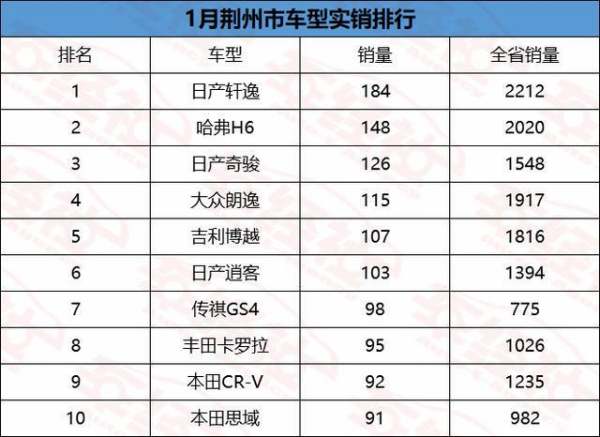 地处江汉平原腹地的荆州市,1月份市场销售新车4717辆,在省内各地市中排名第五。与大部分普通地级市一样,荆州市销量前十的车型中没有豪华品牌,合资品牌占据了七个席位,自主品牌仅哈弗H6、吉利博越、传祺GS4三款车型上榜。