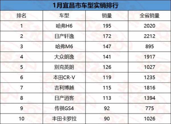 作为鄂西重镇的宜昌市,1月汽车销量6328辆,在湖北省排名第三,与襄阳市差距不大。1月销量前十名的车型中,自主品牌占据四席,合资品牌占剩下六席,全部为普通家用车型。不过,从上榜的十款车型可以看到,东风系车型在宜昌并不存在本地效应,这有点令人难以理解,基本上呈现出合资车型与自主车型五五开的局面。