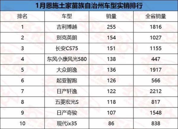 1月,恩施土家苗族自治州汽车销量5860辆,排在全省第四位,比传统工业强市的黄石市竟然高出了好几个名次,有点令人诧异,与其近年来交通环境大幅度改善,经济快速发展不无关系,在湖北省边缘,远离省会武汉的恩施州,东风系车型本土作战的优势同样被刨除,此外,榜单上功能性MPV的出现也从侧面反映了恩施州的经济发展水平,旅游和农业在该地区经济占主导地位。
