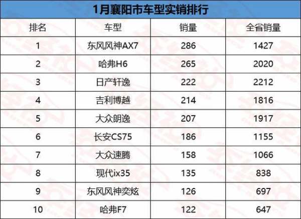 东风系车型依然在襄阳市汽车销量中占据较大比重,但整体上没有武汉的集中度高。排名第一的东风风神AX7销量为286辆,同门车型东风风神奕炫在襄阳的销量为126辆。作为1月全国轿车销量冠军的日产轩逸在襄阳也有着222辆的成绩,位列第三名。东风系车型的畅销足以见证当地百姓对东风制造的认可。