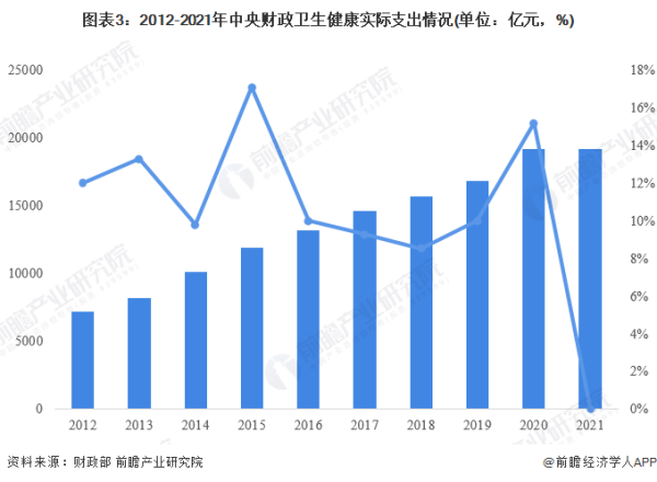 2012-2021年,财政部公共卫生实际支出整体呈上升趋势。2020年,财政部医疗卫生支出为19201亿元,比上年增长15.2%;2021年,财政部医疗卫生支出为19205亿元,比上年增长0.02%。预计未来国家对公共卫生领域的投入将继续保持平稳增长态势。