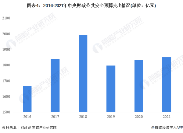 近年来国家对公共安全的重视程度也不断提高,不仅出台了一系列相应的政策法规,对公共安全的财政投入也在不断加大。2016-2018年我国公共安全预算支出呈现上升趋势,2018-2019年出现下降,但在2019年出现下降后,之后两年呈现稳步增长态势,2021年公共安全预算支出达到1850.92亿元,2016-2021年公共安全预算年复合增长率为1.75%。预计未来国家财政对公共安全的支出将继续维持平稳增长。