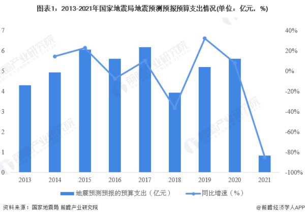 2021年,国家地震局在地震预测预报上的预算支出为0.84亿元,同比下滑85.05%,主要是基本建设项目经费减少。