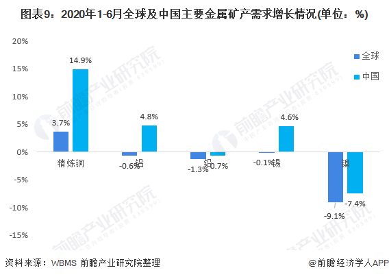 受到主要国家产业结构调整、贸易摩擦及新冠肺炎疫情的影响,2020年全球金属矿产品需求走势分化,表现整体不及预期。世界金属统计局统计数据显示,2020年上半年,全球范围内仅有精炼铜的需求量较上年同期有所增加,其余产品的需求量均有所下降。从中国市场的需求看,中国精炼铜、铝、锡的需求显著强于全球市场,而其余矿产品需求则与全球市场趋同。