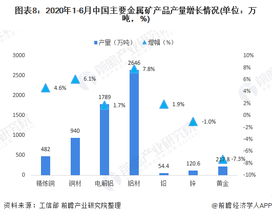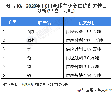 从主要金属矿供需缺口看,原铝、锌、铅、镍矿产品供应过剩,其中原铝供应过剩量为133.5万吨:精炼铜矿及锡矿供应短缺,2020年上半年数据统计铜矿需求缺口为15.5万吨,锡矿供需缺口为1.74万吨。