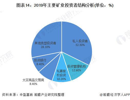 2019年全球主要的矿业投资者主要有私人投资者(32.3%),投资管理机构(12.6%),私募股权投资(10.2%),大宗商品交易商(8.4%),投资银行(8.4%)及其他类型投资者(28.1%)