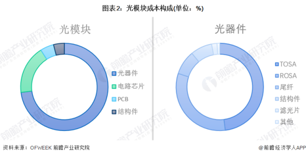 光模块产品所需原材料主要为光器件、电路芯片、PCB以及结构件等。其中,光器件的成本占比最高,在73%左右。光器件主要由TOSA(以激光器为主的发射组件)、ROSA(以探测器为主的接收组件)、尾纤等组成,其中TOSA占到了光器件总成本的48%;ROSA占到了光器件总成本的32%。