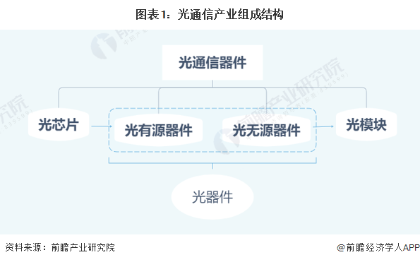 光通信器件根据其物理形态的不同,一般可以分为:芯片、光有源器件、光无源器件、光模块与子系统这四大类,其中,光芯片为光器件(光有源器件和光无源器件)的重要组成部分,而光器件是光模块的重要组成部分。