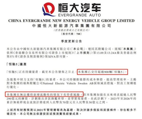 这可不是社长故意抹黑。“交付超900辆”、“面临停产风险”的字眼,都是恒大汽车3月22日在港交所发布的公告里,自己曝出来的。